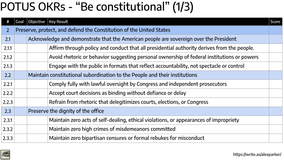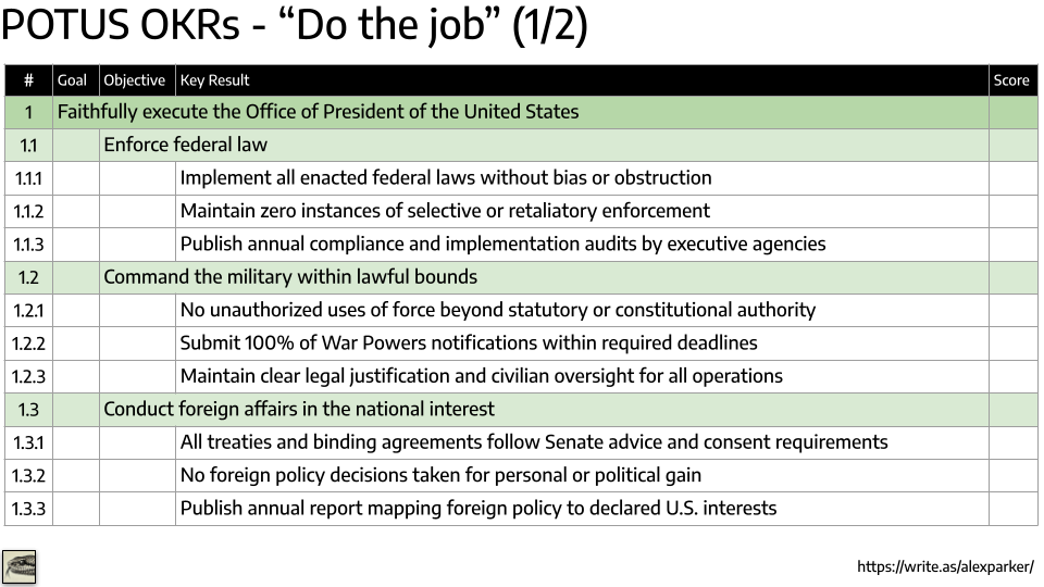 The OKRs offer a stable frame: What’s the job? Are they doing it? Are they doing it lawfully, competently, and in a manner befitting the office?