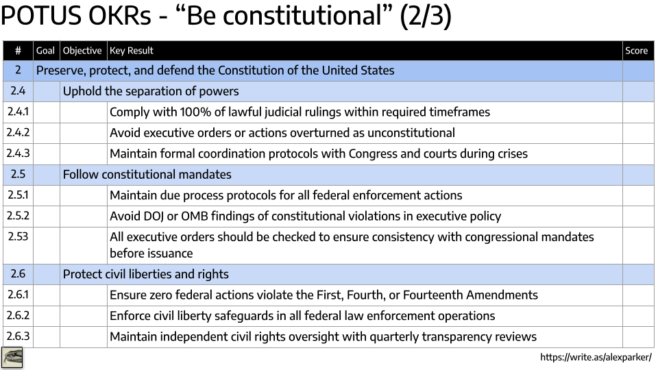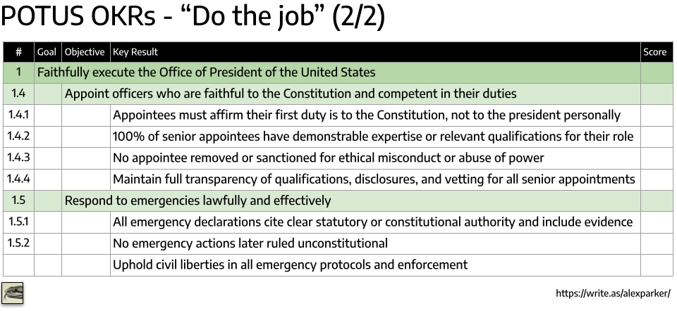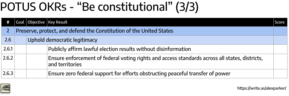 The following OKRs are based on the two goals as outlined above. Now, one big caveat: these OKRs don’t encompass every task of the presidency. Instead, they set the fundamental ground rules for how the President must operate as our employee. They are the equivalent of a job’s responsibilities and expectations, the non-negotiable duties and standards of conduct, on top of which, policy achievements are built