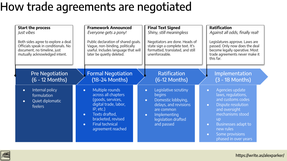 There aren’t many delightful things that came out of Q1 2025, but one of them was the very peculiar claim that the US administration would get ninety deals done in ninety days. It’s funny because that’s not how trade negotiations work.