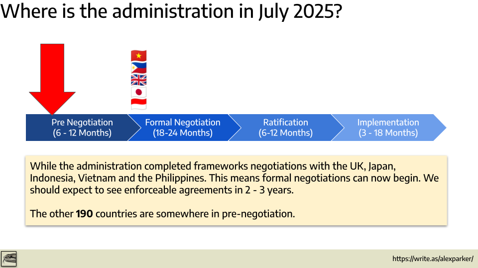 Five countries (Vietnam, the Philippines, the UK, Japan, and Indonesia) have progressed to formal negotiations. Which means all the rainbows, cupcakes, and unicorns handed out to reach the framework stage will likely shrink into a few line items buried deep in the harmonized tariff schedule. And of course we’re years away from an enforceable agreement.