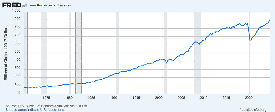 - The “strong dollar” seems to have had very little impact on US services exports. In fact, US Services exports are now ~$1T (twice the next largest exporter, Great Britain).