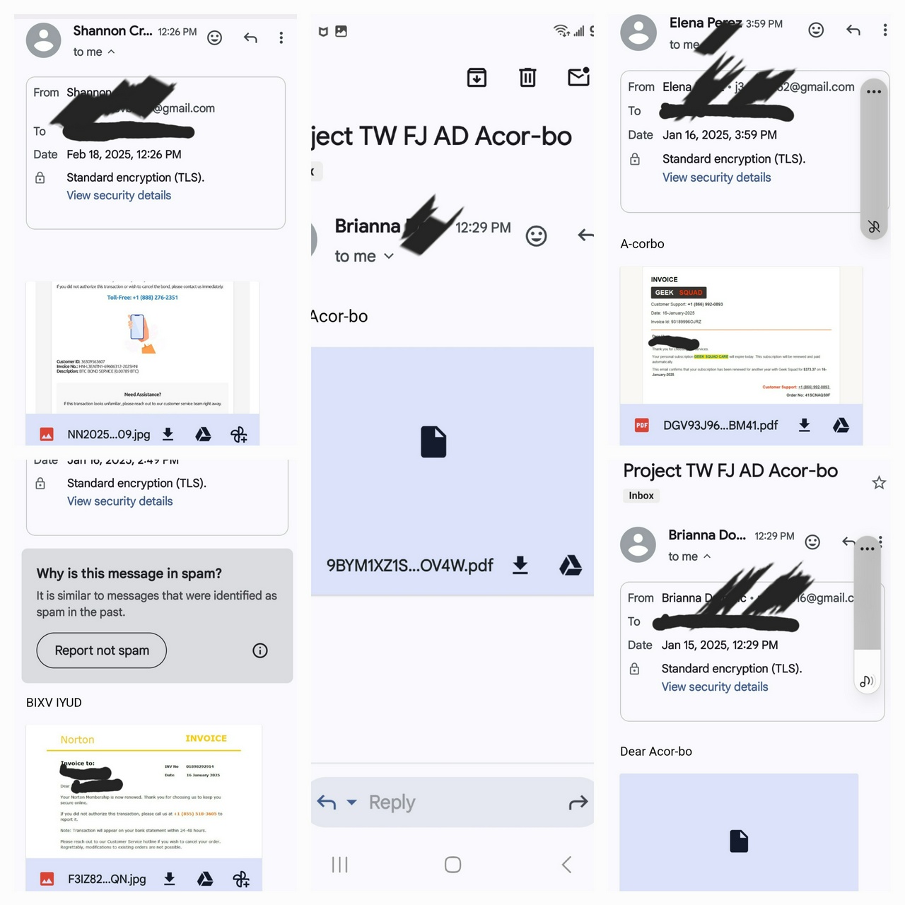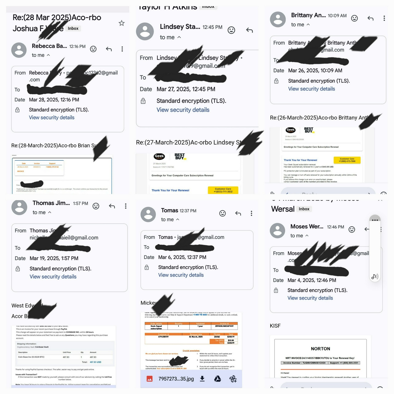 Notice the different times, different days, frequency & repetition of various UNREAL names used when the emails were sent. The maximum amount in each collage would be 6 because that is the most on my end a collage will hold. One collage is 5 invoices, two of them are 6 invoices & the last one is 3. If you count that is at least 20 separate incidents of cyberstalking.