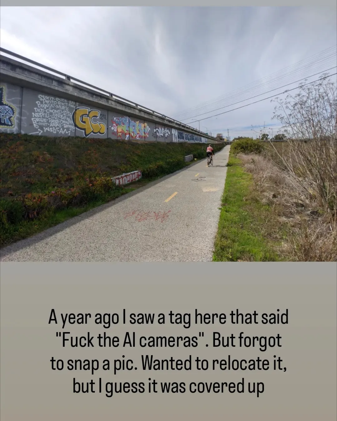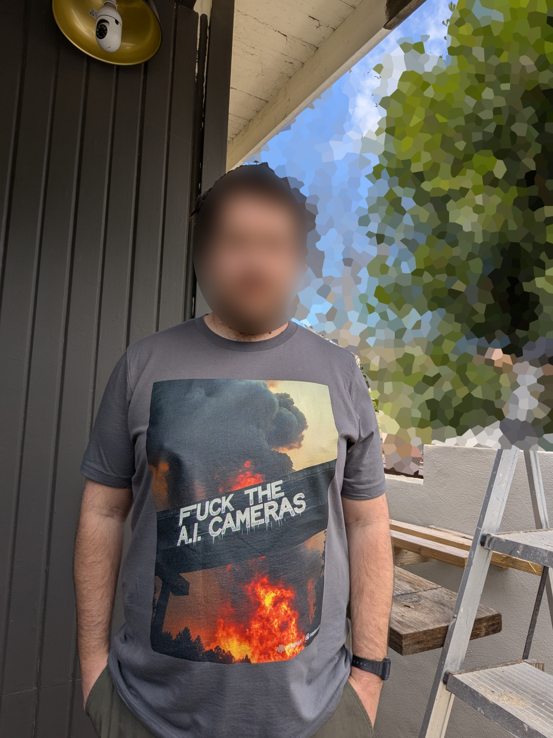 That included a hiking trail that was also an active construction site, an overpriced cafe where I had a nice chat with an elderly man, and the 7 Eleven where I bought two dirty homeless guys lunch. More pedestrians and homeless people in the area glanced at it confusedly. The point of the shirt is to be seen IRL and make people think. I'll take more emo survivalist fit pics with it too. The origin of the message was personal to some graffiti artist I'll never meet, and now deepfaked into a shirt.