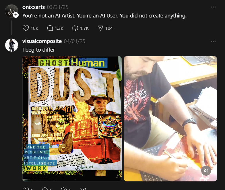 I have a friend Aaron Ackerson who was a fan of my old AI art visuals on TikTok. He's also an AI artist, has a longer career as a musician, and streams on Twitch. Normally he's a sweet guy. He was so hurt, or maddened by the digital artists' hate comments under his posts, and their death threats in his Twitter DMs, that he had to create this strange song and music video.