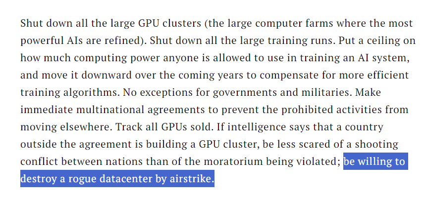 Time Magazine even let “AI alignment researcher” Eliezer Yudkowsky write an op-ed that suggests destroying the dark satanic server mills back in 2023.