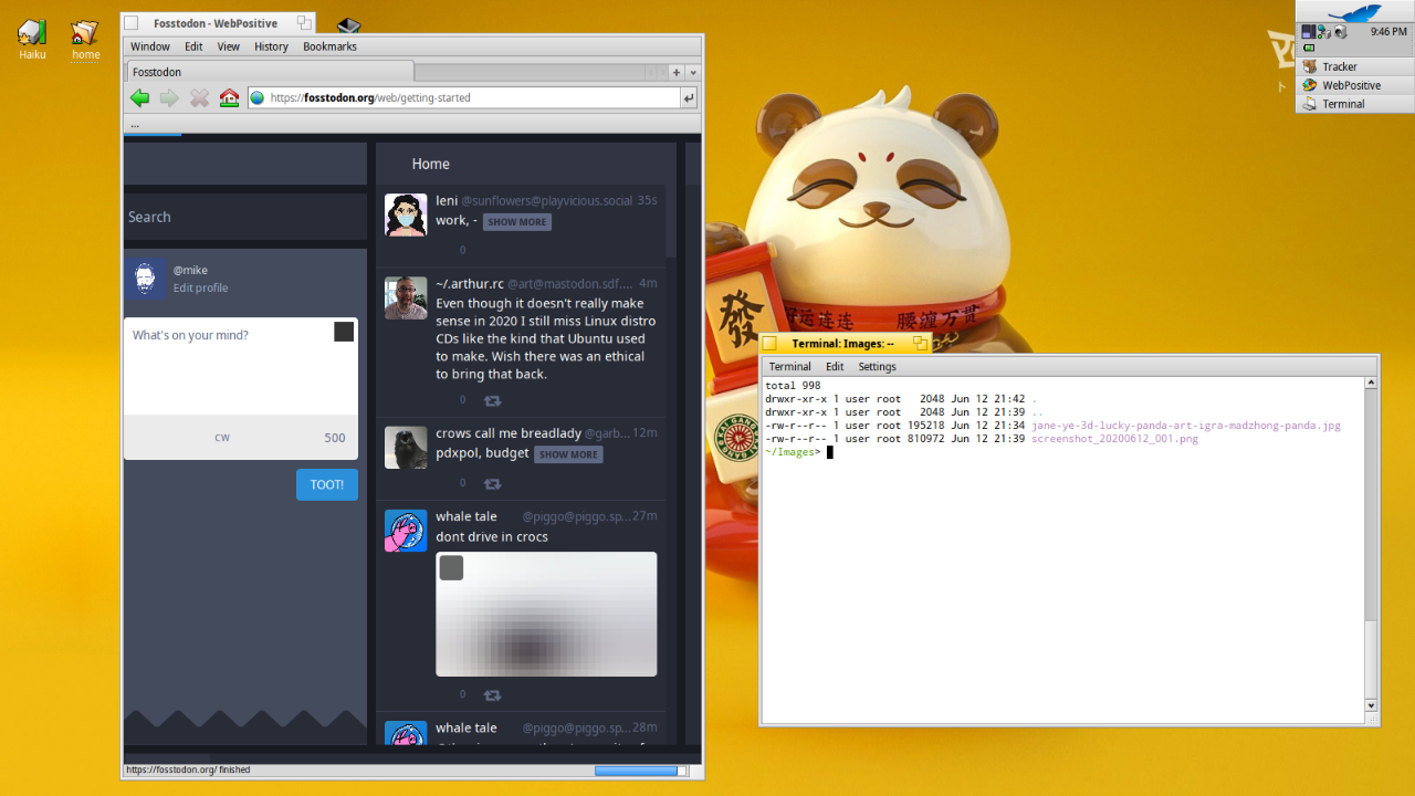 No OS would be complete these days without a web browser, and Haiku includes one called WebPositive. It works... OK. Not great. I was able to load most pages, but a page like Fosstodon took a long time to load. Probably close to a minute, possibly two. But, it did load.