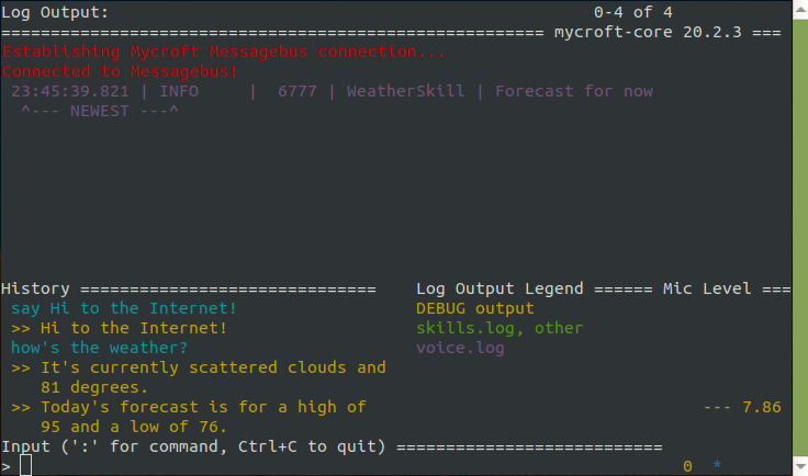 What if you're running Mycroft on a computer that doesn't have audio output or a microphone to speak to it with? Mycroft has a built in command, “mycroft-cli-client”.