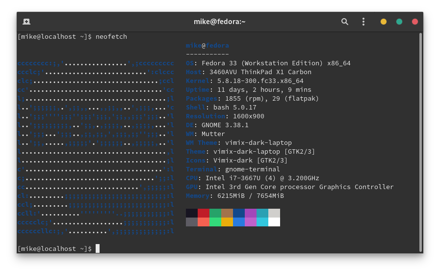 A word of caution though. I'm currently using Fedora, but I noticed that when I used the —ascii_distro flag and selected a distro that wasn't Fedora, it messed with the colors. If you're using a non-Fedora distro, you may have to use the “—ascii_distro Fedora” to make it come out with the proper color scheme.