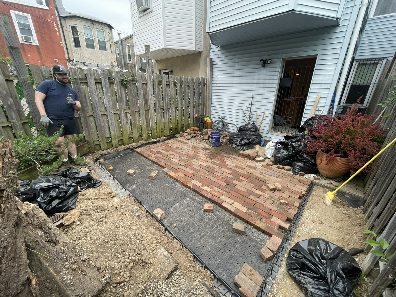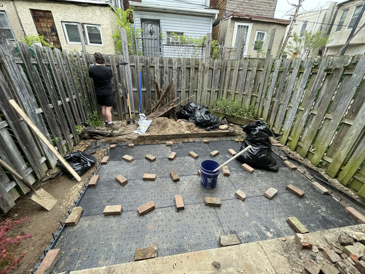 After that, it was time for the sand. We put down a layer of paving sand, about an inch high, which we used 1” PVC to measure out. We screeded the sand, prepared the edge guard, and then set down some paver base panels (being held in place with bricks in the following picture):