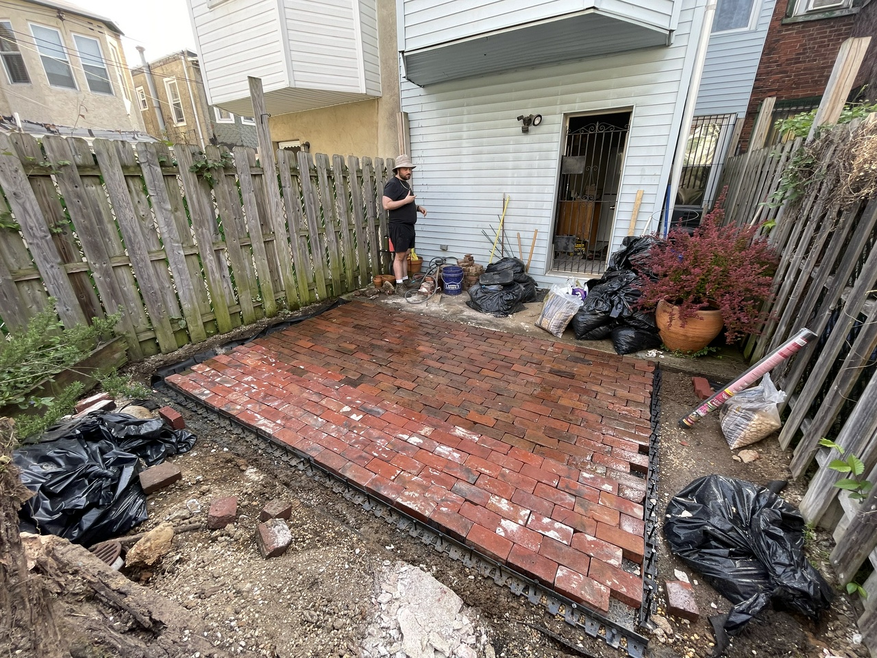 Using the same bricks from the old patio, plus some Facebook marketplace freebies, we got to work laying down the new pattern. We chose to do the standard offset horizontal pattern, mostly because we knew we had a lot of half broken bricks, which would make for great edge pieces. Here’s the patio with most of the bricks in place: