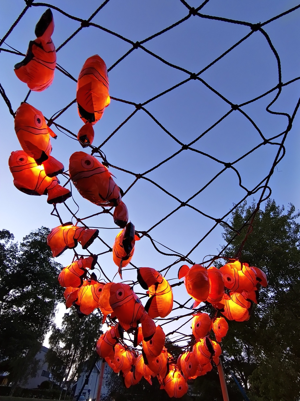 Die Abendsonne färbt die zarten Wolken rosarot. Die Herbstfeste werfen hier an der Küste ihre Schatten voraus wie hier das Lichterfest.