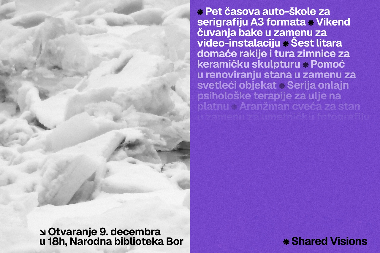 Aukciju umetničkih radova organizujemo u Boru od 9. do 26. decembra. Možete da ponudite nešto svoje zauzvrat za umetničko delo koje vam zapadne za oko – može i za novac, ali cenimo i dobru ideju, znanje, materijal, uslugu ili bilo šta drugo što već možete da date.