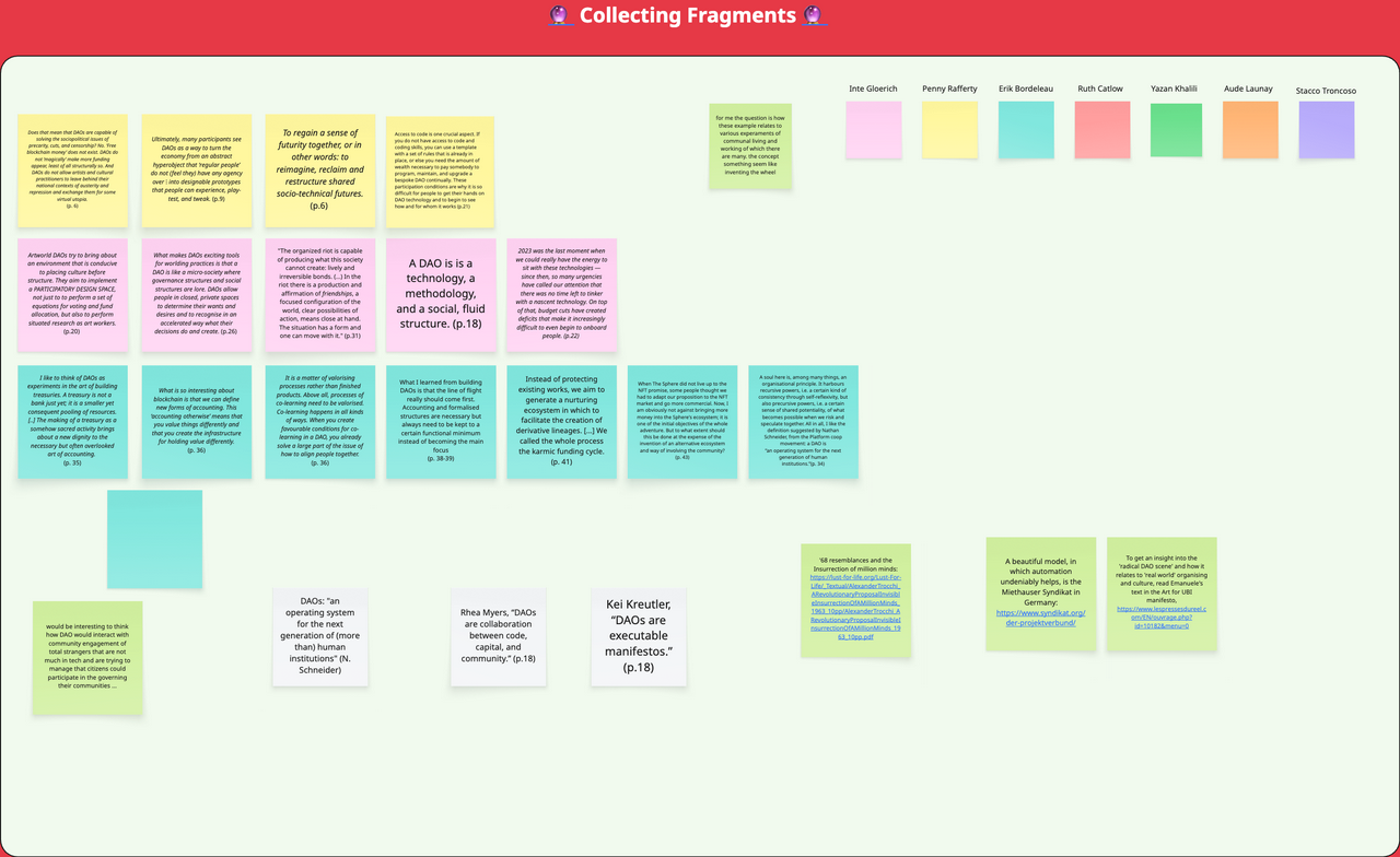 The reading group was structured across four meetings, each dedicated to exploring one of the volume's key interviews, beginning with Penny Rafferty's reflections on Black Swan DAO, moving through Erik's account of The Sphere and Ruth Catlow's work on CultureStake, and concluding with Yazan Khalili's vision for Dayra. While the four projects span different geographies and contexts – from Berlin’s art scene to the Occupied Territories of Palestine – they all share a similar approach to blockchain technology and the idea of DAOs.