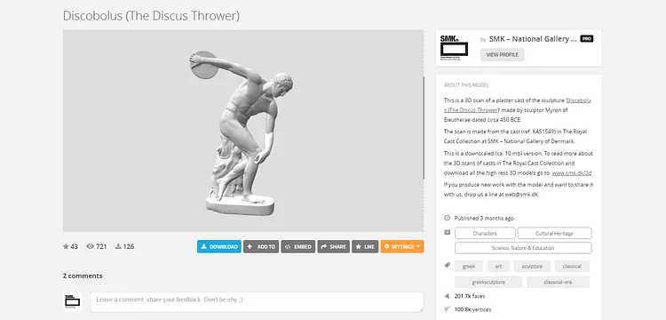 The key objective of the Digital Casts project is to make the 3D models available to everybody. Of course, this involves more than simply putting a download link up at smk.dk. We have to make them visible and easy to find — thereby facilitating use in various private, artistic and commercial contexts. As yet, we have presented the project to the world in a range of ways: partly via our own media and at the launch event, and partly by pushing the 3D models away from our own platforms, uploading them to platforms where animators, home printers and 3D professionals usually use. As yet, the sculptures are available for download and unrestricted use at Sketchfab, Thingiverse and TurboSquid.