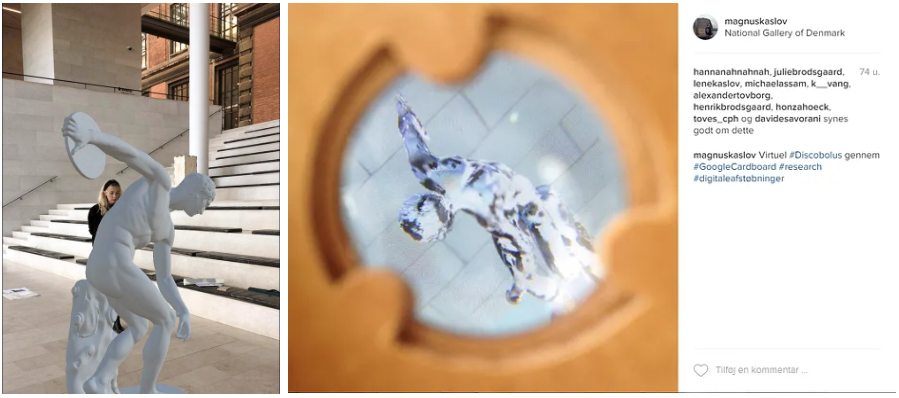 Testing the digital casts in augmented reality. On the left an test at the SMK with digital producer at SMK Rine Rodin and on the right a screenshot from Instagram of an early test with virtuality and Google Cardboard. Photos by Magnus