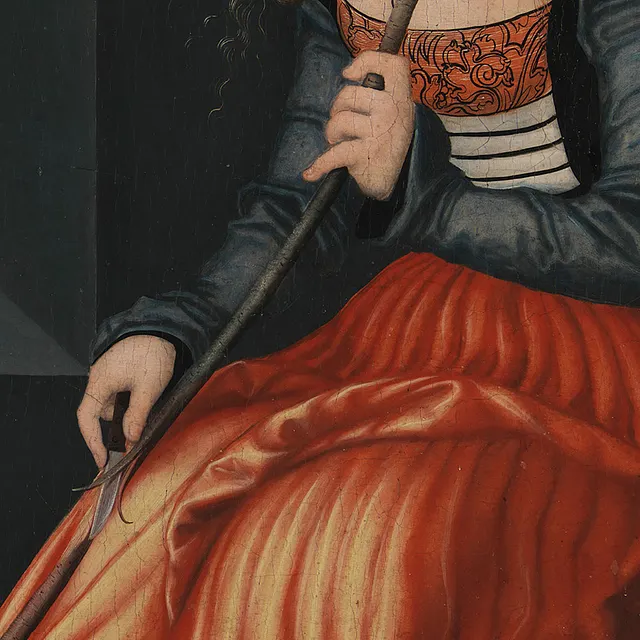 The six artworks are presented in their full splendour on the contest website [link no longer active]. But we couldn’t resist plunging into the beautiful and peculiar motifs and cherry-pick some of the details that fascinate us and get our creative minds brewing. In this post, we’ll zoom in on two pieces — the strange depiction of Melancholia by Cranach the Elder, and a portrait of the artist Købke’s sister clad in beautiful harmonic colours. The next couple of posts will highlight details from the remaining four seleceted pieces by Hammershøi, Jerichau Baumann, Ring, and Gijsbrechts, so stay tuned!