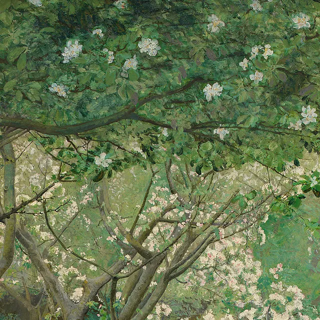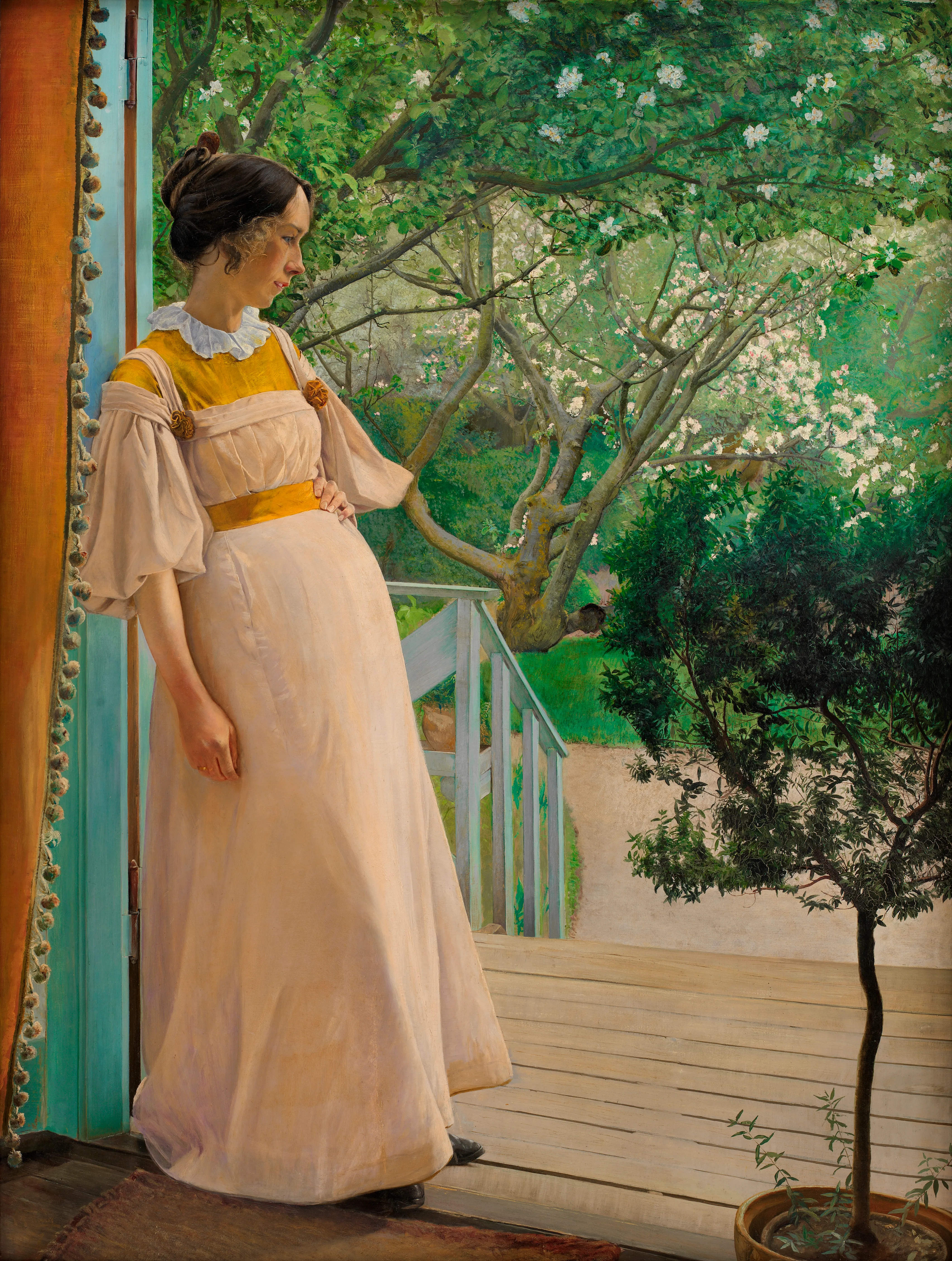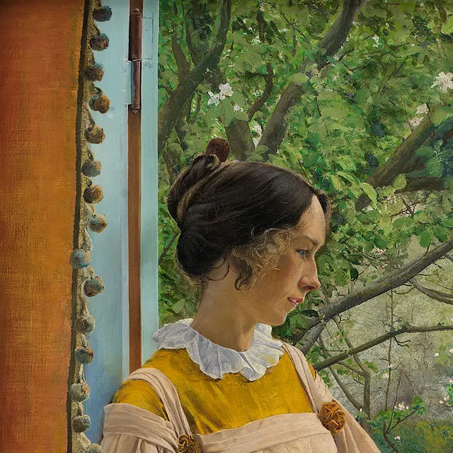 A significant detail that lept to our eyes when choosing this painting for the contest is the multitude of softly rounded shapes dispersed all over the composition — the pom-poms on the fringe of the curtain, the curry-coloured fabric roses on Sigrid’s dress, and the white blotches of apple blossoms amidst all the green outside the door.
