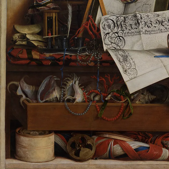 Exotic conchs, precious chains of pearls, sumptuous fabrics, bright red corals, elegantly wrought calligraphy. This is a veritable Wunderkammer of inspiration.