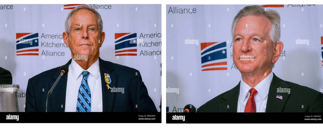 L-R: Rep. Joe Wilson (R-SC) and Sen. Tommy Tuberville (R-AL) spoke at the 16 July 2025 news conference with the American Kitchen Cabinet Alliance. These photos are available from the Alamy photo agency’s D.C. Notables collection.
