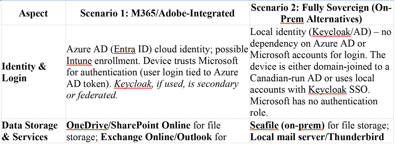 In essence, Scenario 2 forces an attacker into the realm of active compromise with a high risk of detection. There’s no silent “API” to request data; no friendly cloud admin to insert code for you. The attacker would have to either break in or trick someone, both of which typically leave more traces. Microsoft’s influence is reduced to the operating system updates, and if those are controlled, Microsoft cannot easily introduce malware without it being caught. This is why from a sovereignty perspective, experts say the only way to truly avoid CLOUD Act exposure is to not use U.S.-based products or keep them completely offlinecyberincontext.cacyberincontext.ca. Here we still use Windows (a U.S. product), but with heavy restrictions; one could go even further and use a non-U.S. OS (Linux) to remove Microsoft entirely from the equation, but that’s beyond our two scenarios.