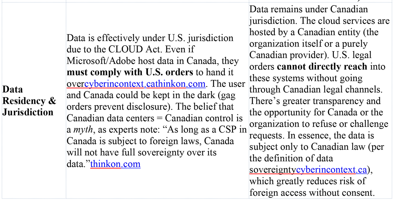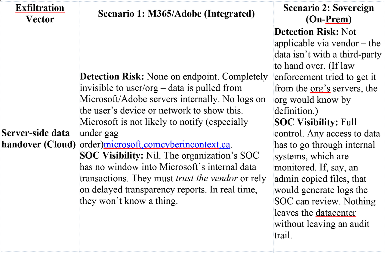 Scenario 1 (Integrated with U.S. Cloud Services): Here, the organization enjoys state-of-the-art cloud tools and probably lower IT burden (since Microsoft handles identity management infrastructure, update delivery, server maintenance for Exchange/SharePoint, etc.). Users likely have a smooth experience with their files and emails syncing across devices, rich collaboration features, and so on. However, the sovereignty risk is significant. As Microsoft’s own representative admitted in 2025, if the U.S. government comes knocking for data – even data stored in a foreign jurisdiction – Microsoft will hand it over, “regardless of [Canadian] or other country’s domestic laws.”cyberincontext.cacyberincontext.ca Data residency in Canada does not equal protection, because U.S. law (CLOUD Act) compels U.S. companies to complythinkon.com. This directly undermines the concept of “Canada’s right to control access to its digital information subject only to Canadian laws”cyberincontext.ca. In Scenario 1, Canadian law is effectively sidestepped; the control is ceded to U.S. law once data is in Microsoft’s cloud. For a public sector or sensitive organization, this means potentially breaching legal requirements (many Canadian government departments have policies against certain data leaving Canada – yet using O365 could violate the spirit of that if not the letter, due to Cloud Act). The national security implication is that foreign agencies might get intelligence on Canadian operations without Canadian oversight. The scenario text mentioned that even Department of National Defence (DND/CAF) uses “Defence 365” – a special Microsoft 365 instance – and that in theory none of that is immune to U.S. subpoenascyberincontext.ca. This is a glaring issue: it means a foreign power could access a nation’s defense data covertly. As a result, experts and officials have been raising alarms. For example, Canada’s own Treasury Board Secretariat acknowledged that using foreign-run clouds means “Canada cannot ensure full sovereignty over its data.”thinkon.com And commentators have said this “undermines our national security and exposes us to foreign interference”, calling for sovereign cloud solutionsthinkon.comthinkon.com. In everyday terms, Scenario 1 is high-risk if one’s threat model includes insider threat at the vendor or foreign government orders. From a red-team perspective, Scenario 1 is like an open barn door: multiple avenues exist to exfiltrate data with minimal chance of getting caught. The defending org in Scenario 1 might also have a false sense of security – because everything is “managed” by reputable companies, they might invest less in their own monitoring (assuming Microsoft will take care of security). That complacency can lead to blind spots, as we described in detection. Finally, there’s also a vendor lock-in and reliability concern: reliance on Microsoft/Adobe means if those services go down or if the relationship sours (imagine political sanctions or trade disputes), the organization could be cut off. The ThinkOn blog cited a warning that the U.S. could even direct cloud providers to cut off Canadian clients in extreme scenariosthinkon.com. That’s an extreme case, but not impossible if geopolitics worsened. Essentially, Scenario 1 trades some sovereignty for convenience, and that comes with latent risks that may not manifest until a crisis – at which point it’s too late to easily disentangle.