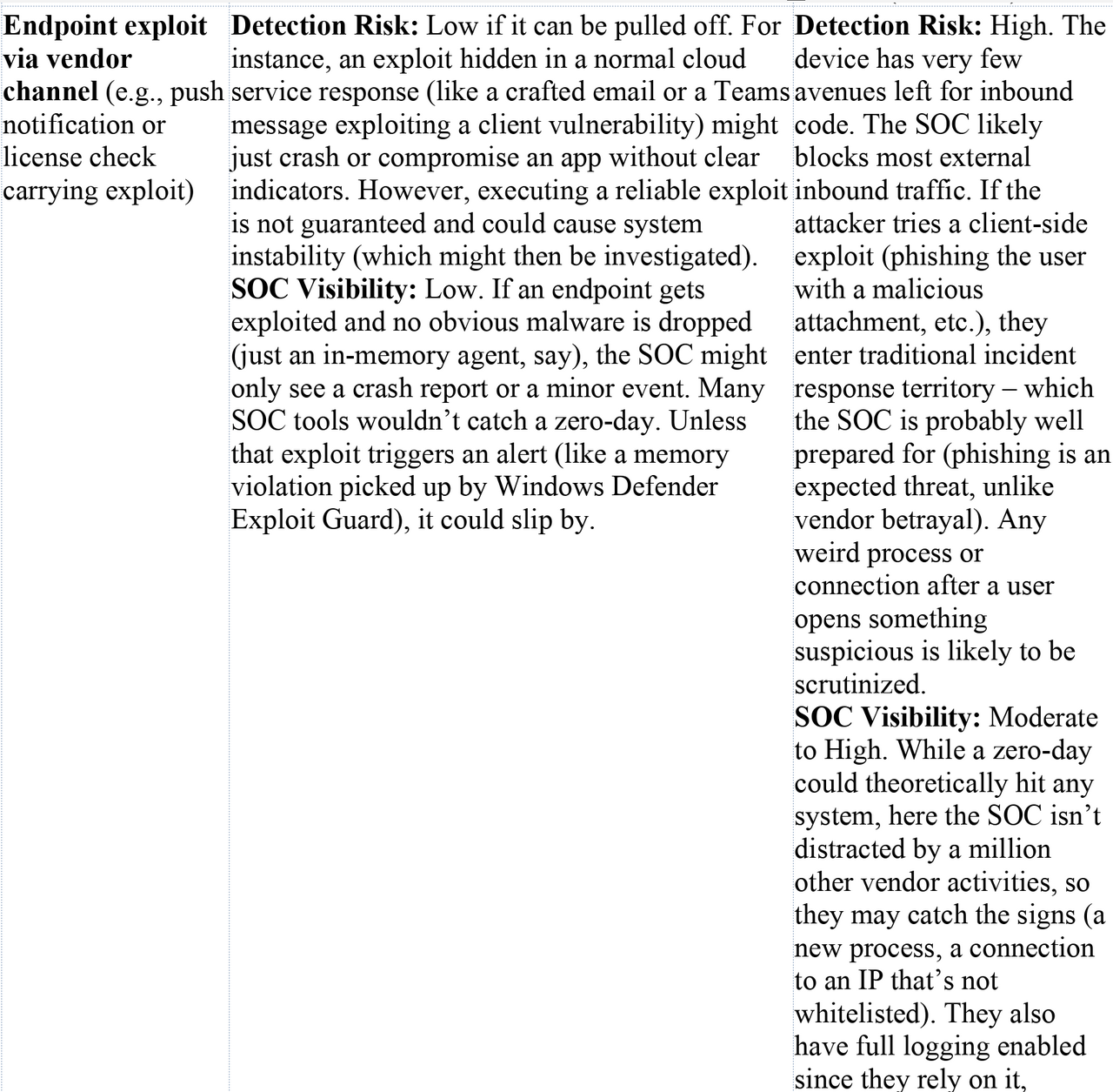 Overall, detection in Scenario 1 requires a very vigilant and somewhat paranoid SOC – one that assumes the trusted channels could betray them. Most organizations do not assume Intune or O365 will be turned against them by the service provider. Insider threat from the vendor is not typically modeled. Therefore, they may not be watching those channels closely. As a result, an exfiltration could succeed with low risk of immediate detection. Forensic detection after the fact is also hard – how do you distinguish a malicious Intune script from a legitimate one in logs, especially if it’s been removed? The endpoint might show evidence of file archives or PowerShell execution, which a skilled investigator could find if they suspect something. But if they have no reason to suspect, they might never look. And if Microsoft provided data directly from cloud, there’d be nothing on the endpoint to find at all.