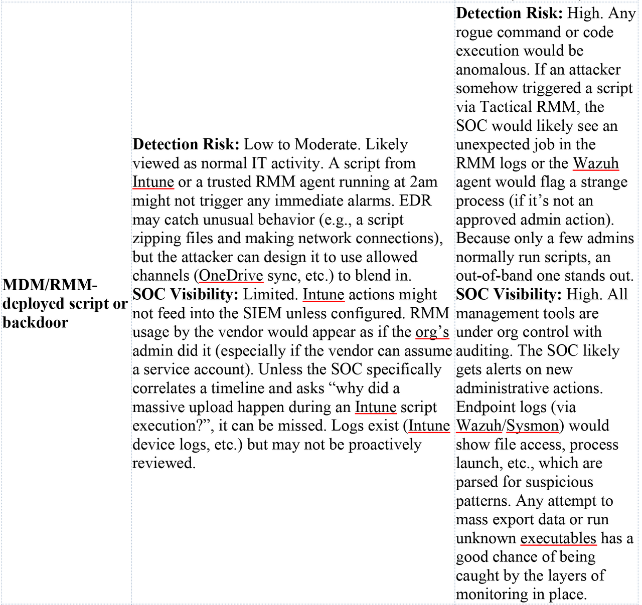 If an attacker tried an Intune-like approach by compromising Tactical RMM, the defenders might notice strange behavior on the RMM server or an unplanned script in the RMM logs. Given the sensitivity, it’s likely the org closely monitors administrative actions on their servers. And any outsider trying to use those tools would have to get past authentication – not trivial if properly secured. Even a supply chain backdoor, if triggered, could be caught by behavior – e.g., if an OnlyOffice process suddenly tries to open a network connection to an uncommon host, the SOC might detect that via egress filtering.