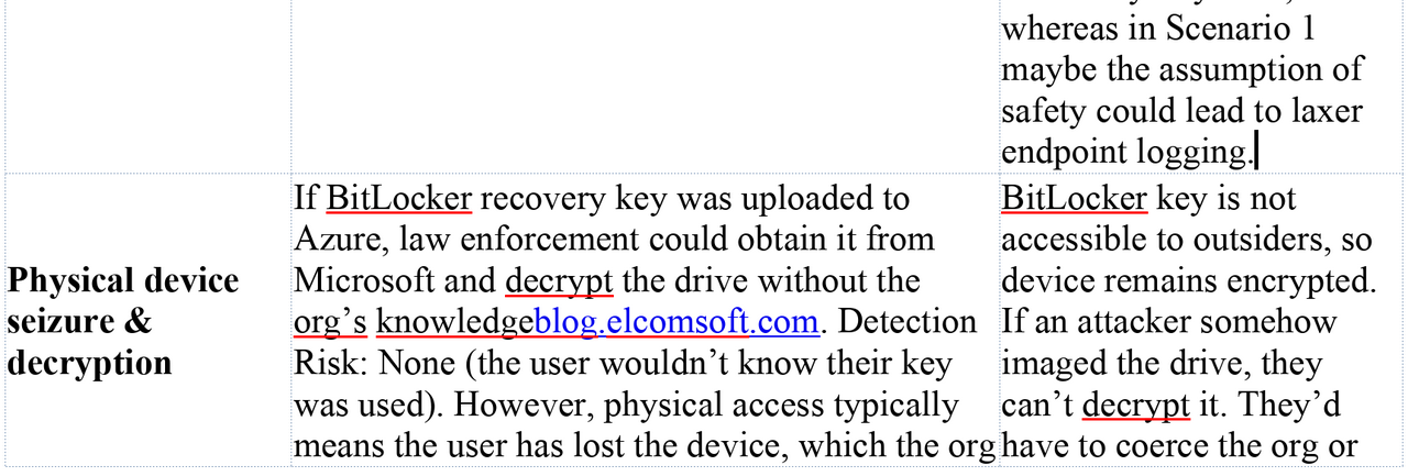 - Physical Access & Key Escrow: A traditional law-enforcement approach to an encrypted device is to obtain the encryption key via the vendor. In Scenario 1, that was viable (BitLocker key from Azure AD). In Scenario 2, it’s not – the key isn’t with Microsoft. If U.S. agents somehow got physical possession of the laptop (say at a border or during travel), they couldn’t decrypt it unless the org provided the key. So physically seizing the device doesn’t grant access to data (the data is safe unless they can force the user or org to give up keys, which again would be overt). So they are compelled to remote tactics.