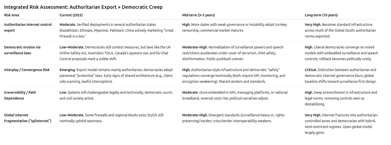 - Long-term (10 years): Critical. Internet fractures into zones of restricted flow. Even democracies operate with embedded surveillance and speech controls. The open, global internet becomes the exception, not the norm.
