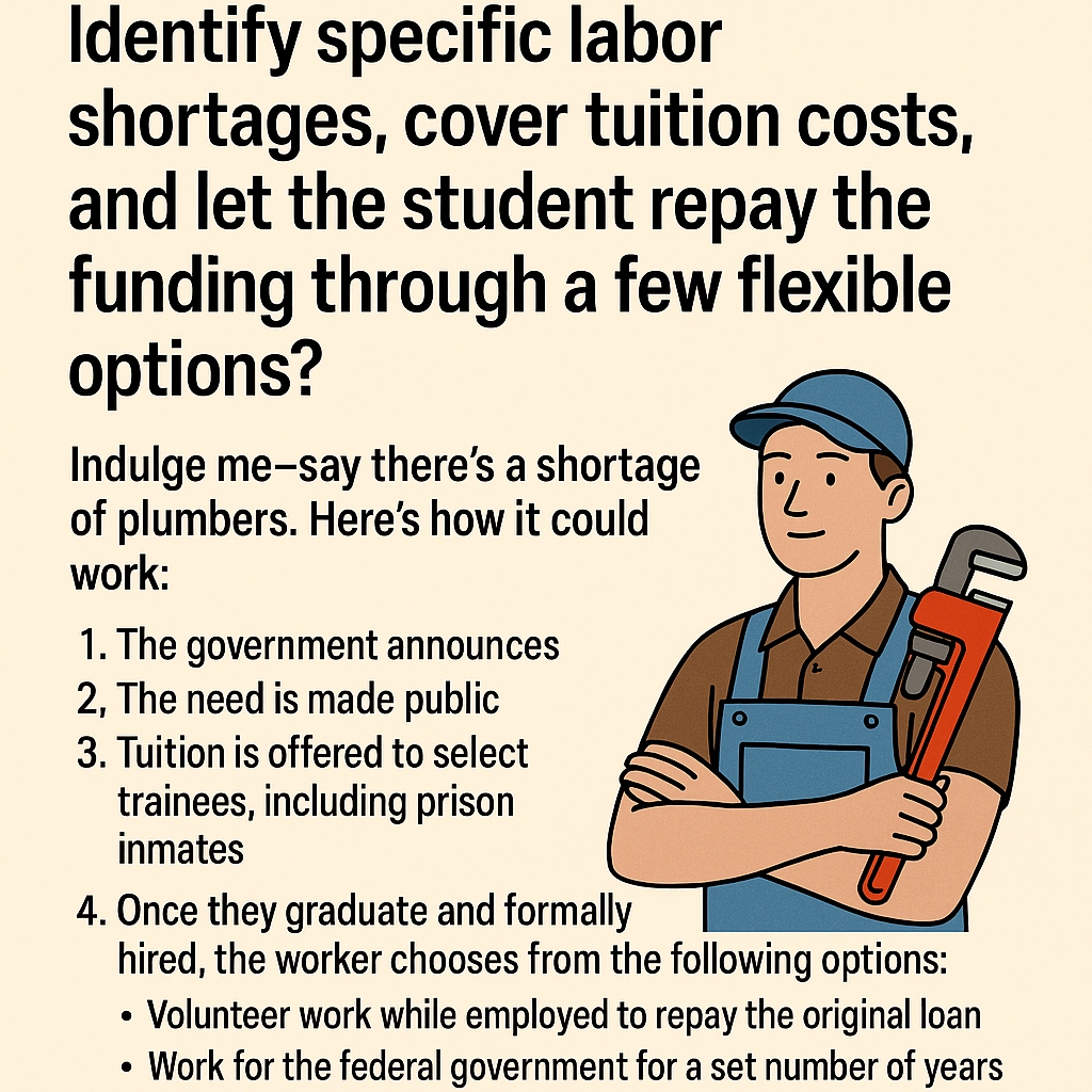 Why can’t a government agencies identify specific labor shortages, cover tuition costs, and let the student repay the funding through a few flexible options?