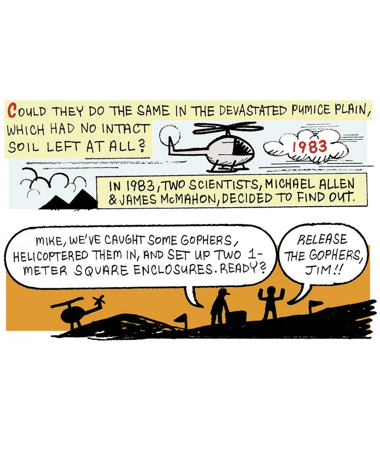 Could they do the same in the devastated Pumice Plain, which had no intact soil left at all? In 1983, two scientists, Michael Allen and James McMahon, decided to find out. They caught some gophers, helicoptered them in, set up two 1-meter square enclosures, and RELEASED THE GOPHERS.