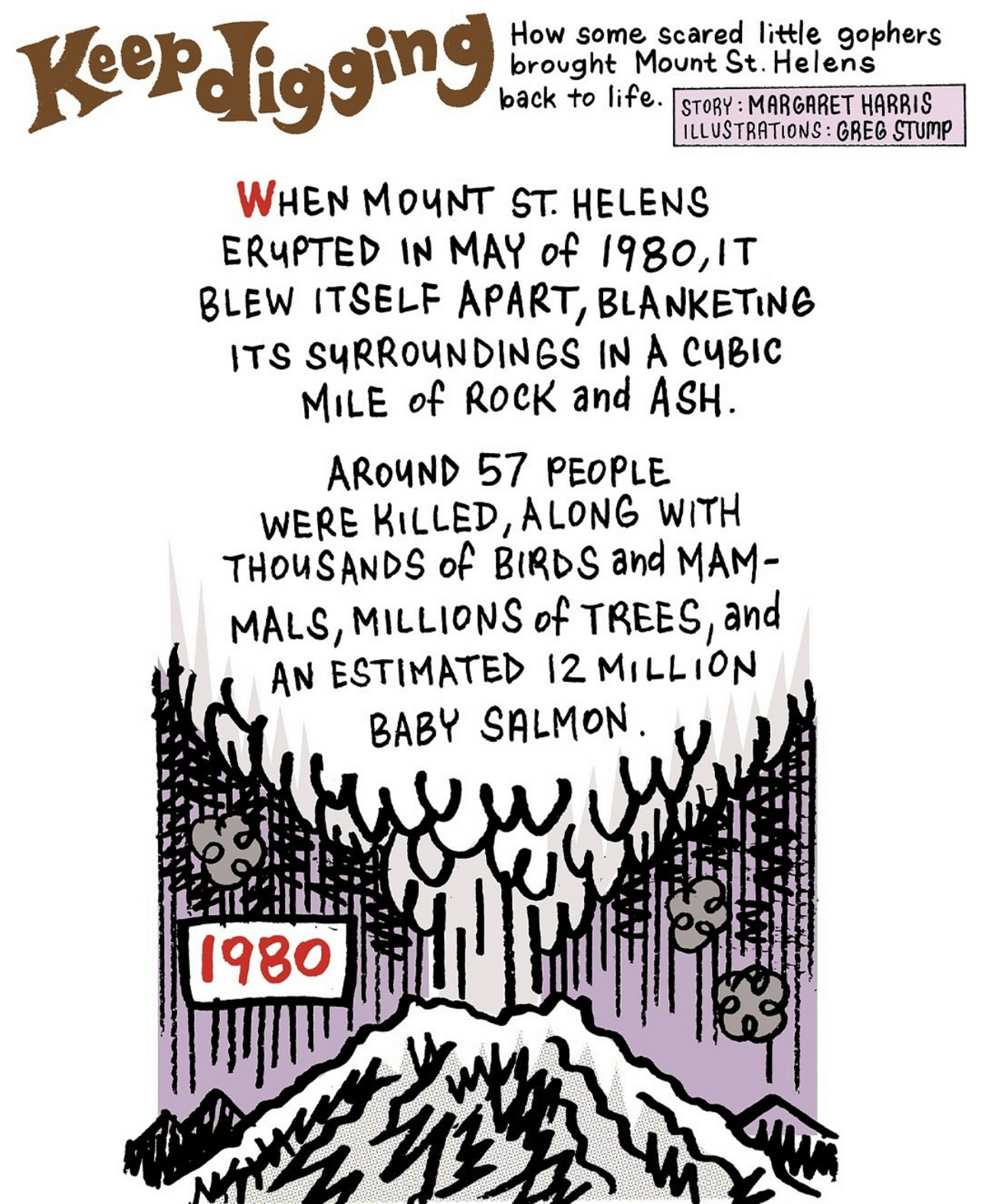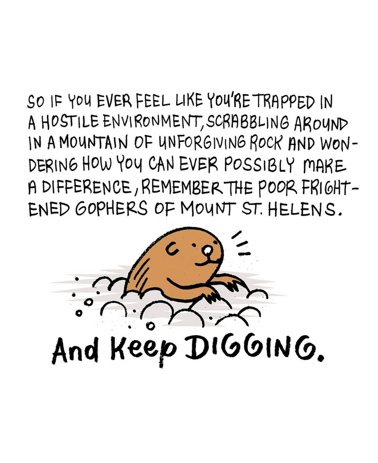 So if you ever feel like you’re trapped in a hostile environment, scrabbling around in a mountain of unforgiving rock and wondering how you can ever possibly make a difference, remember the poor, frightened gophers of Mount St. Helens.