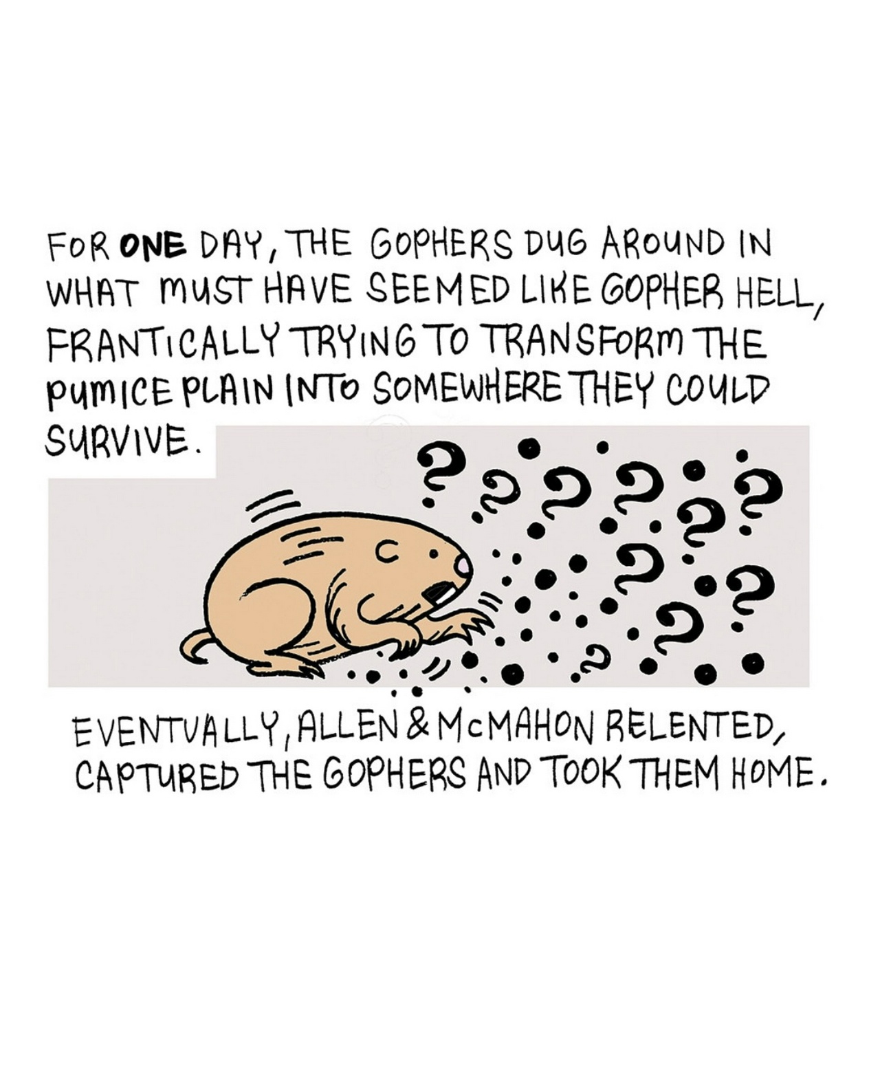 For ONE DAY, these confused gophers dug around in what must have seemed like gopher hell, frantically trying to transform the Pumice Plain into somewhere they could survive. Eventually, Allen and McMahon relented, captured the gophers, and took them home.