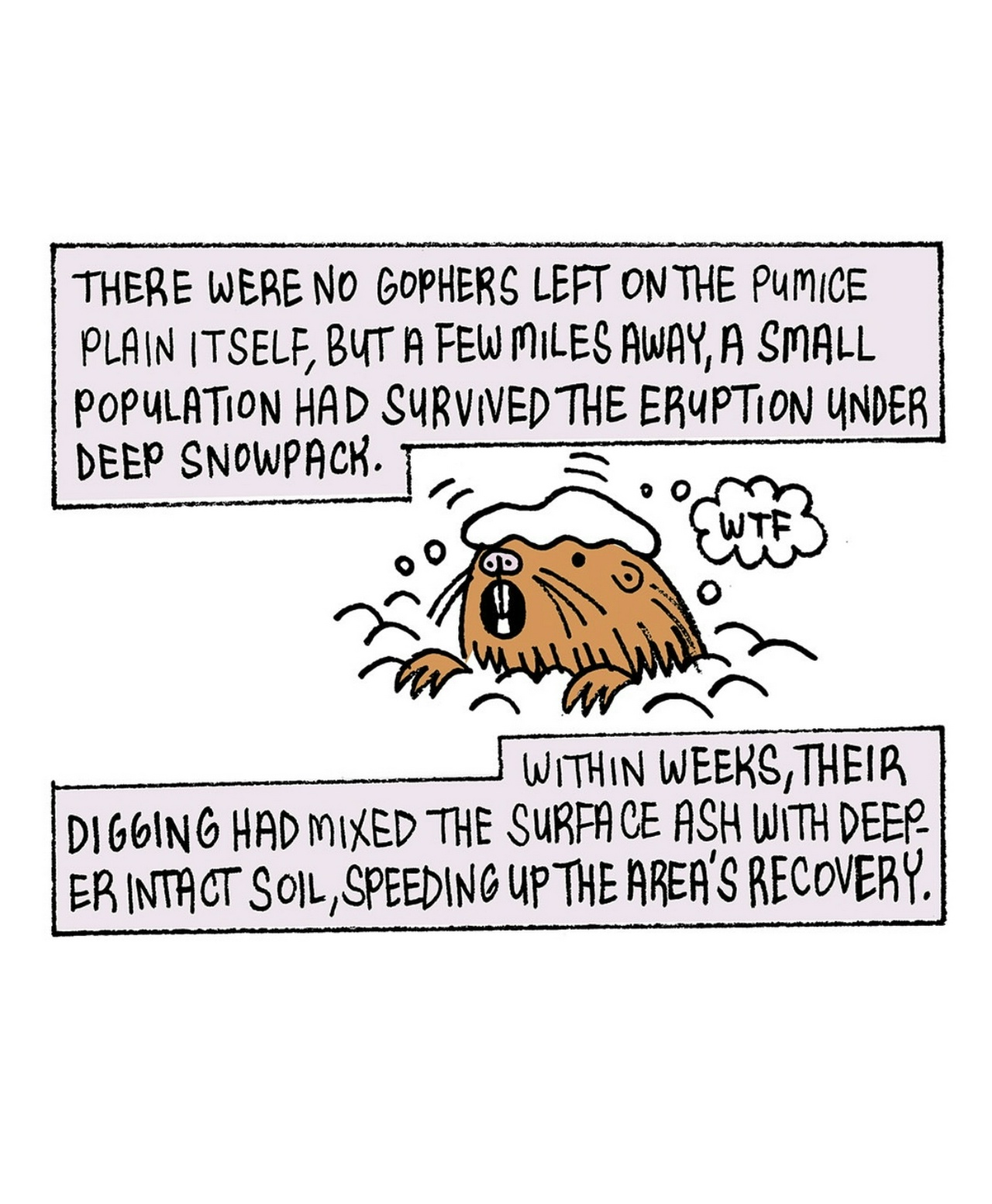 There were no gophers left on the Pumice Plain itself, but a few miles away, a small population had, amazingly, survived the eruption under deep snowpack. Within weeks, their digging had mixed the surface ash with deeper intact soil, speeding up the area’s recovery.