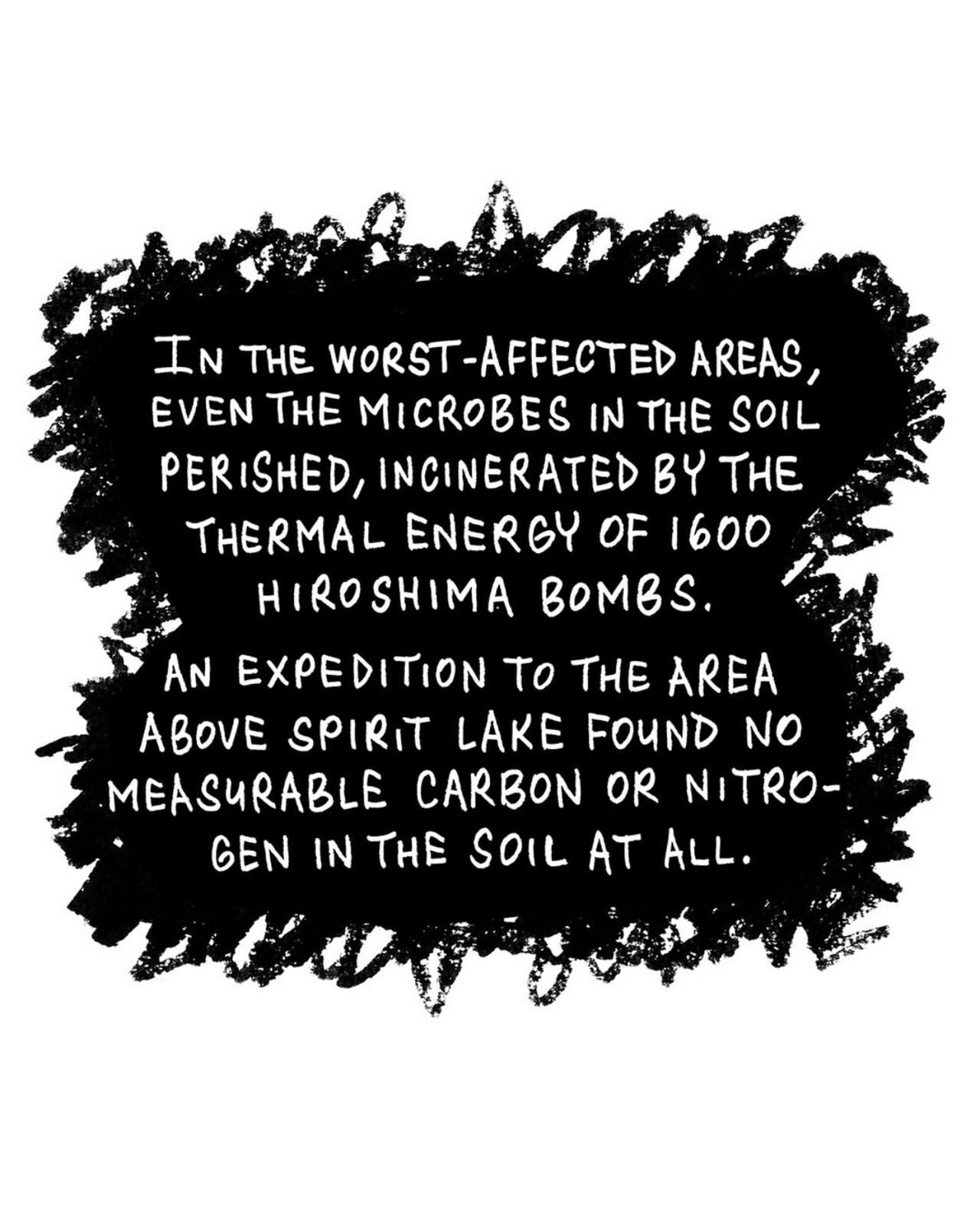 In the worst-affected areas, even the microbes in the soil perished, incinerated by the thermal energy of 1,600 Hiroshima bombs. An expedition to the area above Spirit Lake found no measurable carbon or nitrogen in the soil at all.