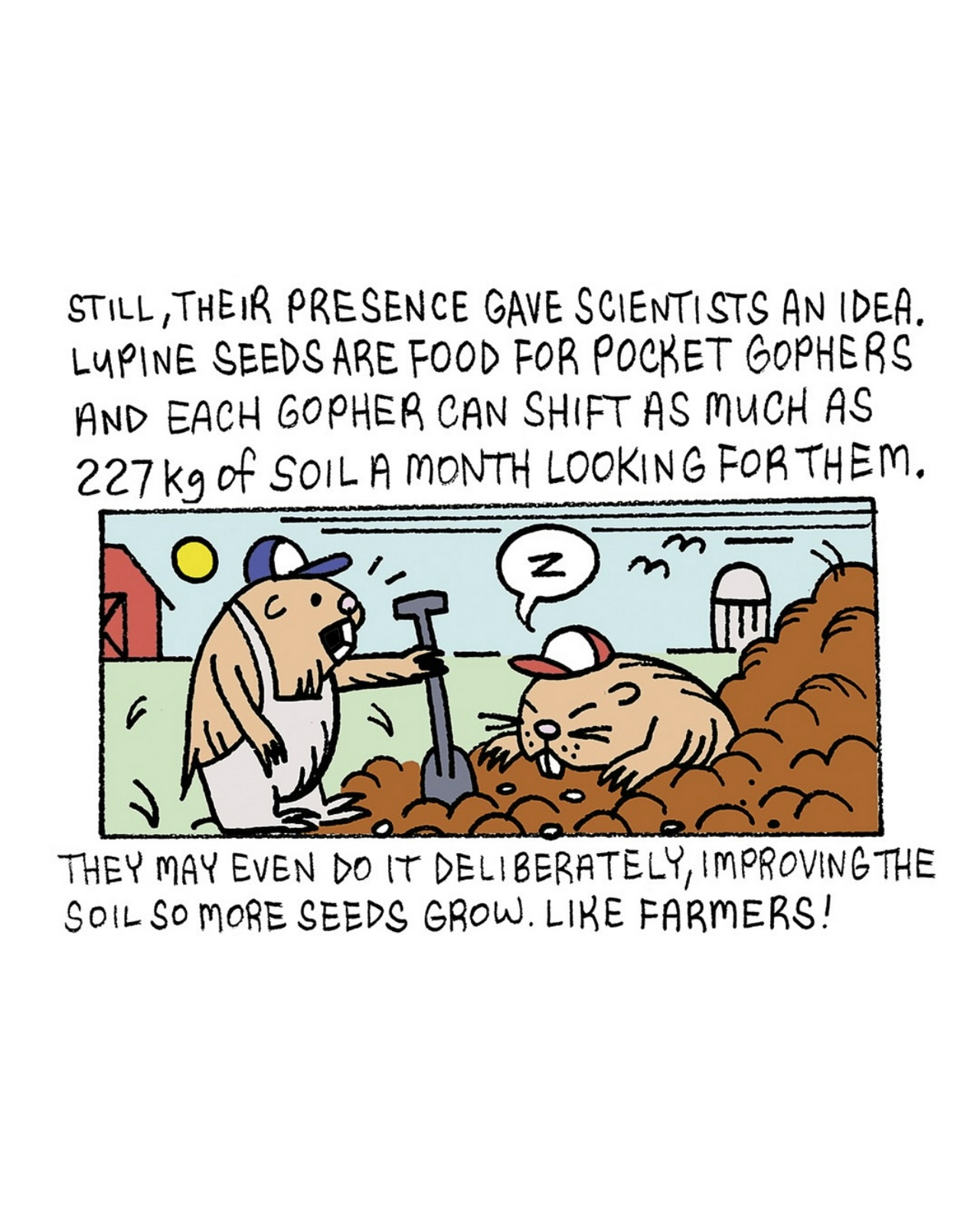 Still, their presence gave scientists an idea. Lupine seeds are food for pocket gophers, and each gopher can shift as much as 227 kg of soil a month digging for them. They may even do it deliberately, improving the soil so more seeds grow. Like farmers!