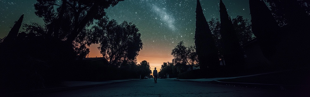 I walk at midnight—a contemplative wanderer in a neighborhood long since surrendered to sleep or the anesthetic glow of blue-lit screens. It’s a Wednesday night that has quietly become Thursday morning. The air is thick with summer heat, but a stiff breeze stirs the trees and brushes the sweat from my skin like an invisible hand.